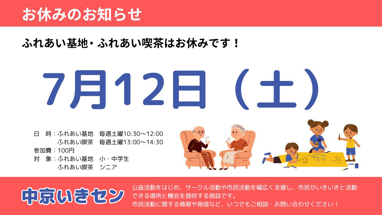 【お知らせ】7/12(土)ふれあい基地・ふれあい喫茶はお休みです